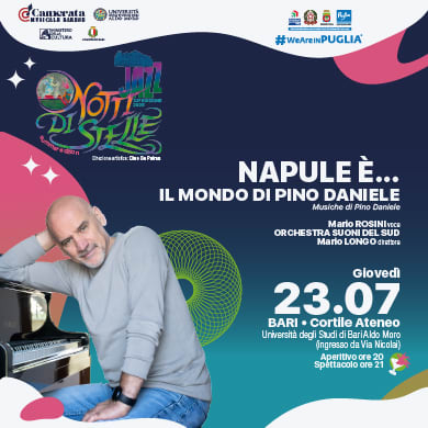Giovedì 23 luglio, il Palazzo Ateneo - Cortile di Bari ospita Napule è… il mondo di Pino Daniele, serata dedicata alla musica del cantautore napoletano nell'ambito della rassegna Notti di stelle - Summer edition 2026. L'evento vede protagonisti l'Orchestra Suoni del Sud e il cantante Mario Rosini, sotto la direzione del M° Mario Longo, in un programma che attraversa blues, soul e tradizione napoletana.
