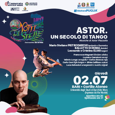 Giovedì 2 luglio, il Cortile di Palazzo Ateneo di Bari ospita Astor. Un secolo di tango, spettacolo del Balletto di Roma dedicato ad Astor Piazzolla nel centenario della nascita. La produzione si inserisce nella rassegna Notti di Stelle - Summer Edition 2026 e propone una rilettura del nuevo tango attraverso la danza contemporanea. Le musiche, arrangiate da Luca Salvadori, sono eseguite dal vivo dal bandoneonista Mario Stefano Pietrodarchi.