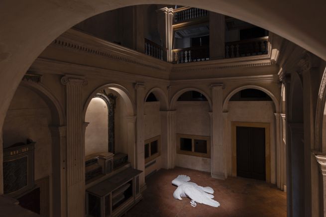 Nell'opera Bones (2025) a giocare un ruolo significativo nel percorso è l’immagine dell’aquila - animale simbolo della montagna e della natura incontaminata - divenuta, sino dall’antichità, espressione di potere, dominio e brama espansionistica. Allestita nell’Ex Oratorio di San Lupo grazie alla collaborazione con Fondazione e Museo Diocesano Adriano Bernareggi, Bones sfida questa tradizione simbolica, presentando l’aquila nella sua forma più pura e vulnerabile: il suo corpo giace a terra con le ali spiegate, come un’icona di sconfitta, un emblema di potenza, sovranità e autorità, evocando la crisi dei valori imperiali e la rottura di un legame con i ritmi della natura. Il materiale nobile con cui è prodotta, il marmo statuario Michelangelo, utilizzato da secoli per celebrare trionfi e immortali virtù, viene ora impiegato per cristallizzare un momento di caduta, rendendolo eterno e quindi ineludibile. Il lavoro è stato ispirato dalla visione dell’aquila commissionata nel 1939 dalla Dalmine - al tempo acciaieria di Stato - allo scultore Giannino Castiglioni per la decorazione del ceppo commemorativo del discorso tenuto da Benito Mussolini nel 1919 agli operai dell’azienda in sciopero creativo, evento che avrebbe dato origine alla costituzione dei Fasci di combattimento. Dopo la guerra l’aquila fu trasferita nel giardino della colonia estiva dell’azienda a Castione della Presolana, in Val Seriana, ai piedi della montagna più iconica delle Orobie. Perso il riferimento al regime, nel nuovo contesto l’aquila si era trovata a rappresentare i più alti valori della natura selvaggia e della libertà. Con la chiusura della Colonia l’aquila è tornata nei depositi della Dalmine SpA.
