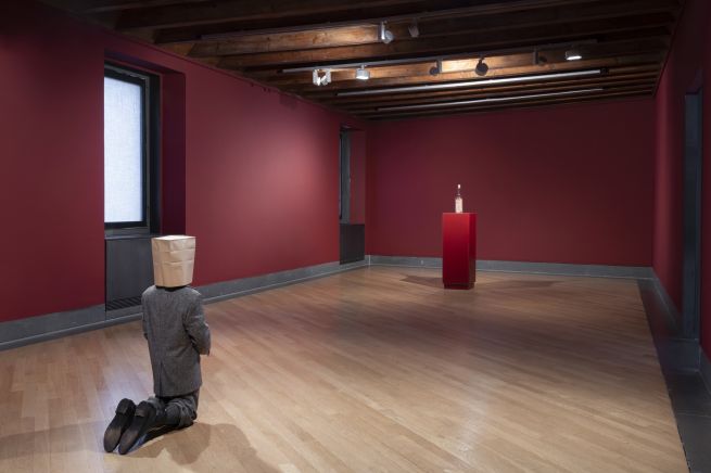 No (2021), il terzo lavoro di Cattelan esposto nelle sale del Gamec, nasce dalla rielaborazione dell’iconica scultura Him (2001), in cui Maurizio Cattelan rappresentava Adolf Hitler inginocchiato in preghiera, con il volto rivolto verso l’alto in un gesto ambiguo, tra supplica e finzione. La figura, modellata con fattezze infantili, evoca a prima vista l’immagine innocente di un bambino, generando un cortocircuito visivo ed emotivo nel momento in cui lo spettatore riconosce l’identità del soggetto. La scelta di coprire il volto - scaturita da una richiesta di censura in occasione di una mostra in Cina - è ambigua: è al tempo stesso una forma di punizione e di protezione. Protezione dello spettatore dal trauma, ma anche del soggetto dal giudizio. Così, No interrompe il circuito del riconoscimento visivo, negando al volto la possibilità di diventare icona. L’occultamento diviene il fulcro dell’opera: il sacchetto non è solo un atto di censura, ma un dispositivo che sposta il focus su ciò che non si mostra, che diventa più inquietante di ciò che si vede.