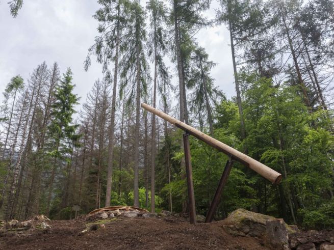 Il lavoro di Pedrini nasce proprio da una riflessione sulla trasformazione dell’ecosistema boschivo, dovuta al cambiamento climatico e alla diffusione di monocolture di abeti rossi che hanno favorito la proliferazione del bostrico, che sta distruggendo ampie aree forestali. Ispirato al Jantar Mantar di Jaipur, un celebre sito astronomico indiano, Magnitudo avrà funzioni semplici ma suggestive, e sarà composto da tre installazioni che non hanno solo una valenza estetica, ma sono veri e propri strumenti di osservazione: Posa è un’area pianeggiante, livellata con assi di legno, che funziona come una meridiana orizzontale e che prenderà vita nel corso del prossimo anno grazie alla partecipazione della comunità. Fino al 7 maggio 2026, ogni mese, persone diverse sono invitate a portare un piccolo sasso da incastonare nel punto segnato dall’ombra della meridiana. Un gesto semplice, ma carico di significato, che si ripeterà fino a quando i dodici sassi andranno a tracciare un analemma solare, figura geometrica che richiama il simbolo dell’infinito. Un segno tangibile di appartenenza, memoria e condivisione; un'opera viva, generata dalla comunità e restituita ad essa come simbolo permanente di un tempo vissuto insieme.