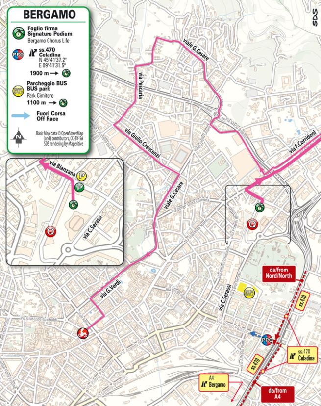 Il percorso cittadino interessa le seguenti vie: via Bianzana, via Corridoni sino al confine, rientro in via Corridoni, via Legrenzi, viale Giulio Cesare, via Quintino Basso, via Pescaria, via Crescenzi, via Lazzaretto, viale Giulio Cesare, piazzale Oberdan, via Cesare Battisti, via San Giovanni, via Verdi, largo Belotti e piazza Matteotti sino a Palazzo Frizzoni. La prima parte del percorso è su strade larghe e rettilinee intervallate da inversioni di marcia e brevi semicurve; le cicliste passano poi verso il centro con una breve e leggera salita a sfiorare la città alta per poi discendere fino all’arrivo al Sentierone.