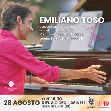 Il Rifugio degli Asinelli a Sala Biellese ospita il concerto del Emiliano Toso Trio, un evento che unisce musica e natura in un'armoniosa esperienza sensoriale. Emiliano Toso al pianoforte, accompagnato da Valentina Wilhelm al violino e Lorena Borsetti al violoncello, offrirà un'esibizione a 432Hz. Questa performance mira a risvegliare emozioni e a trasportare il pubblico in uno stato di benessere duraturo attraverso la Translational Music.