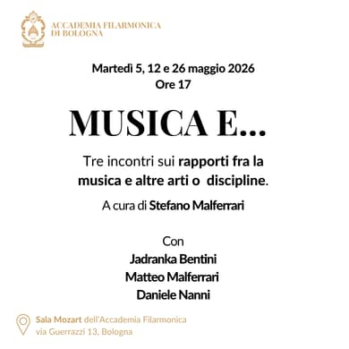 Torna in Sala Mozart, il 5, 12 e 26 maggio, la rassegna "Musica e...", con un ciclo di tre incontri sui rapporti fra la musica e altre arti o discipline.