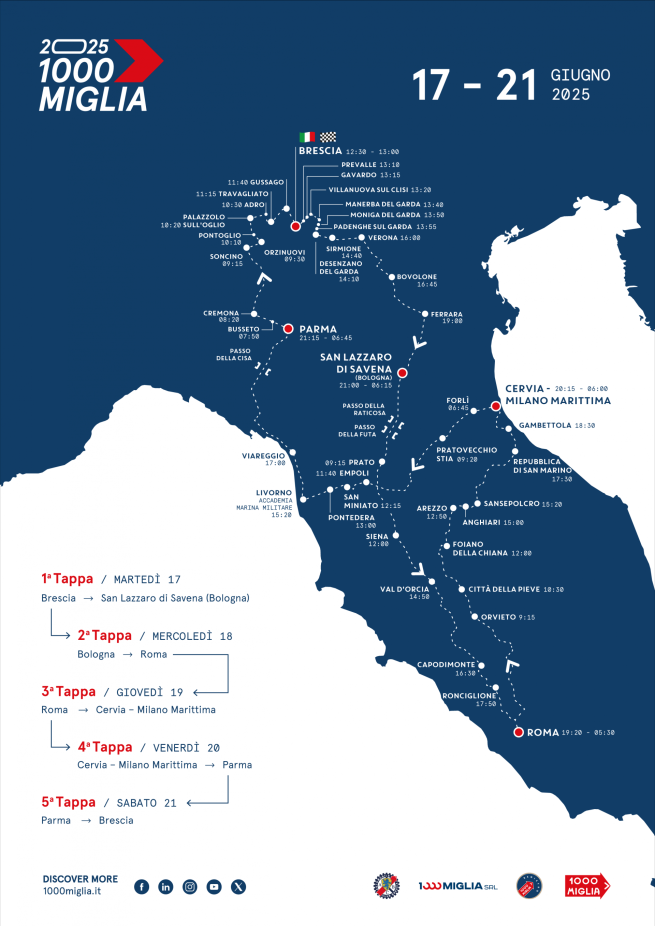Da martedì 17 a sabato 21 giugno 2025 si svolge, con partenza e arrivo a Brescia dopo aver raggiunto Roma, la 1000 Miglia 2025. La quarantatreesima rievocazione storica della corsa disputata dal 1927 al 1957 - la corsa più bella del mondo, come la definì Enzo Ferrari - vede quest'anno oltre 400 auto in gara, che possono essere ammirate in centro a Brescia, più precisamente in piazza della Vittoria e dintorni, a partire da domenica 15 giugno, quando alle 16.30 viene inaugurato il Villaggio 1000 Miglia.