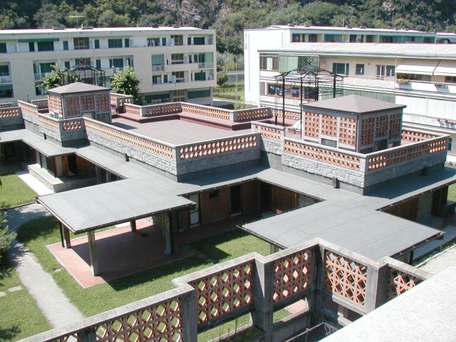 Scuola materna in Canton Vesco a Ivrea (vista delle terrazze, con le caratteristiche murature in pietra e i parapetti in cotto) © courtesy Architetture olivettiane a Ivrea (Archivio Cattaneo Editore e Associazione Archivio Storico Olivetti)