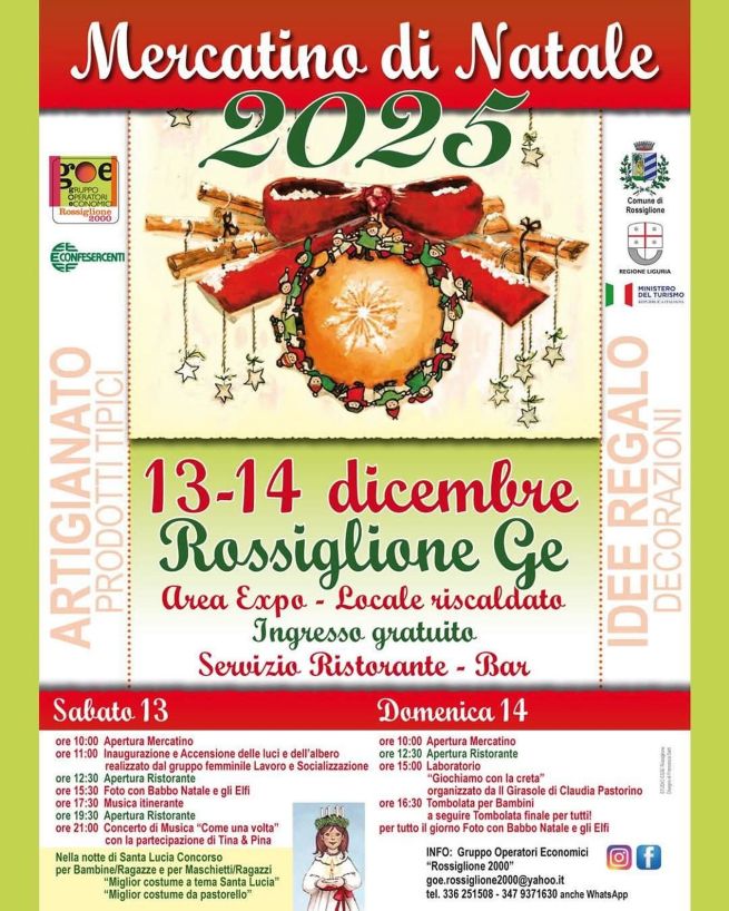 Sabato 13 e domenica 14 dicembre 2025 torna il mercatino di Natale a Rossiglione, presso l'Area Expo, organizzato dal Gruppo Operatori Economici ''Rossiglione 2000'' in collaborazione con il Comune di Rossiglione.