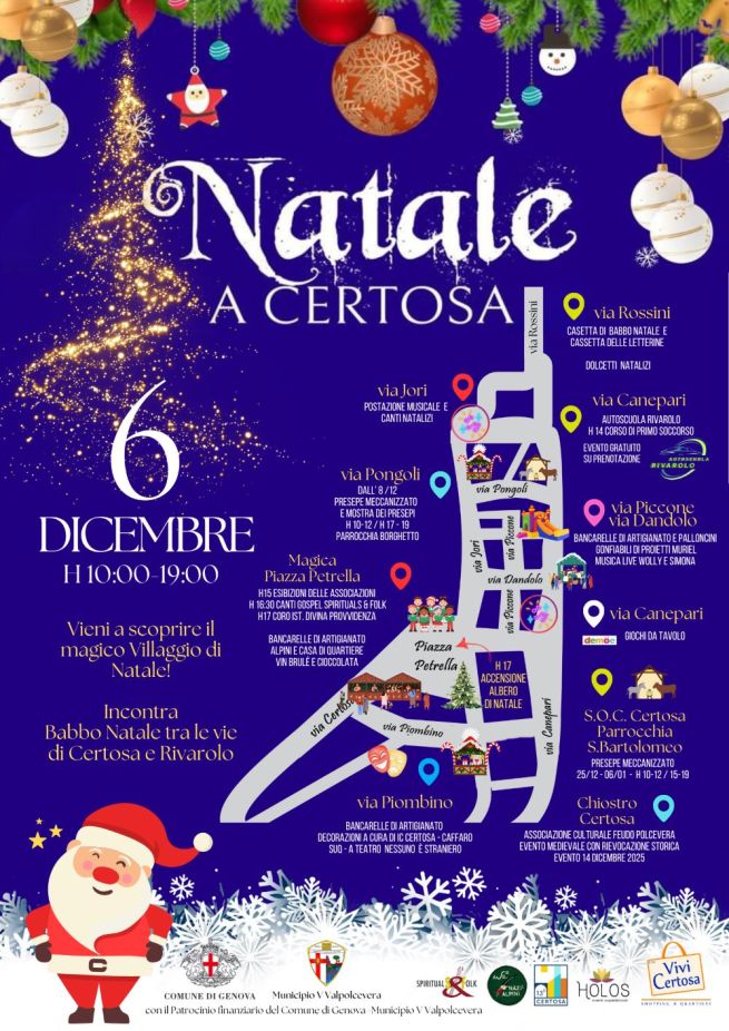 Venerdì 6 dicembre 2025, il quartiere genovese di Certosa si prepara a vivere una giornata all’insegna della meraviglia. Dalle ore 10 alle 19, le sue vie si trasformano in un vero e proprio Villaggio di Natale capace di incantare grandi e piccini. Un'intera comunità si mette in moto per accendere la magia delle feste, tra artigianato locale, spettacoli, degustazioni e la presenza immancabile di Babbo Natale, pronto a incontrare i bambini lungo le strade di Certosa e Rivarolo.