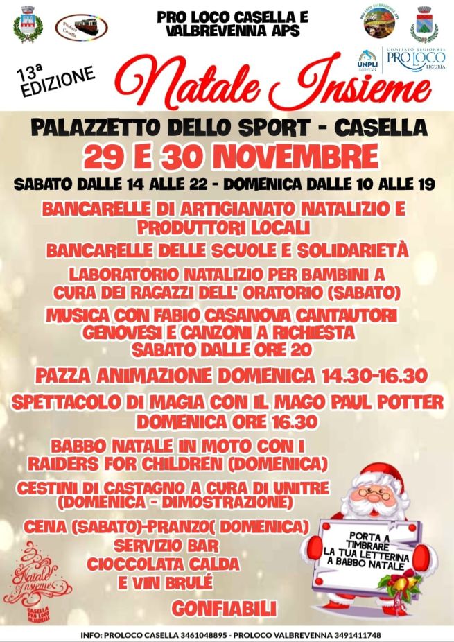 Sabato 29 e domenica 30 novembre 2025, a Casella, torna Natale Insieme (13esima edizione). L'evento, organizzato da Pro Loco Casella e Valbrevenna APS presso il Palazzetto dello Sport, porta bancarelle di artigianato, produttori locali, solidarietà e scuole. La manifestazione propone anche laboratori natalizi per bambini, spettacoli musicali e di magia, animazioni, Babbo Natale in moto e molto altro. Inoltre, i bambini possono portare anche le loro letterine a Babbo Natale.