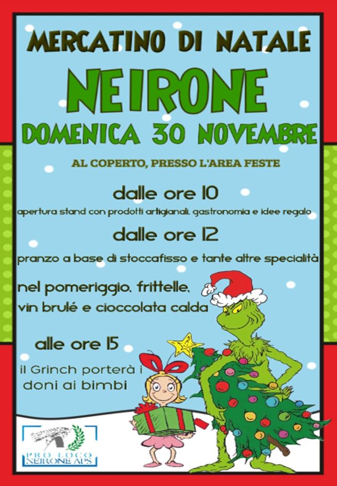 Domenica 30 novembre 2025, a Neirone (al coperto, presso l'area feste) arriva il Mercatino di Natale per vivere la magia delle feste in Val Fontanabuona. Un piccolo villaggio natalizio con oltre 30 banchetti di artigiani, produttori locali e idee regalo uniche per grandi e piccini.