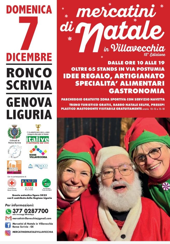 Domenica 7 dicembre 2025, via Postumia, a Villavecchia di Ronco Scrivia, ospita la 15esima edizione dei tradizionali mercatini di Natale. L'appuntamento, ormai consolidato, porta nel borgo 65 bancarelle dedicate all’artigianato, alle idee regalo e alle specialità alimentari. Tra le attrazioni più attese c'è Babbo Natale, presente nella sua casetta per foto e selfie con grandi e piccoli.