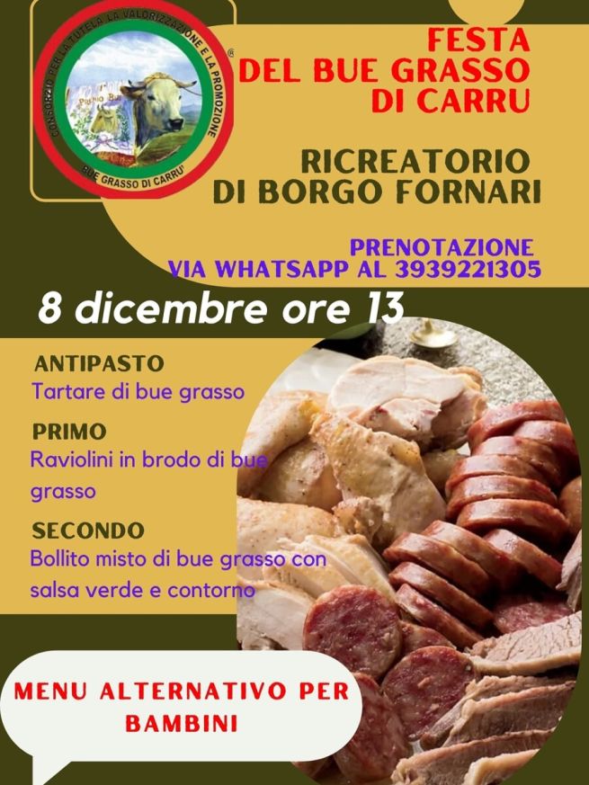 A Borgo Fornari (frazione di Ronco Scrivia) torna la Festa del Bue Grasso di Carrù, a cura del Ricreatorio di Borgo Fornari e di Macelleria Molinari. Appuntamento alle ore 13 lunedì 8 dicembre 2025, nel giorno della festa dell'Immacolata. Pranzo a base di bue grasso di Carrù, certificato dal consorzio, su prenotazione via whatsapp al 393 9221305. Questo il menù: tartare di Bue Grasso, raviolini in brodo di Bue Grasso, bollito misto di Bue Grasso con salsa verde e contorno. Previsto un menù alternativo per bambini. Ulteriori info e aggiornamenti sulla pagina facebook Ricreatorio di Borgo Fornari, dove si svolge l'evento.