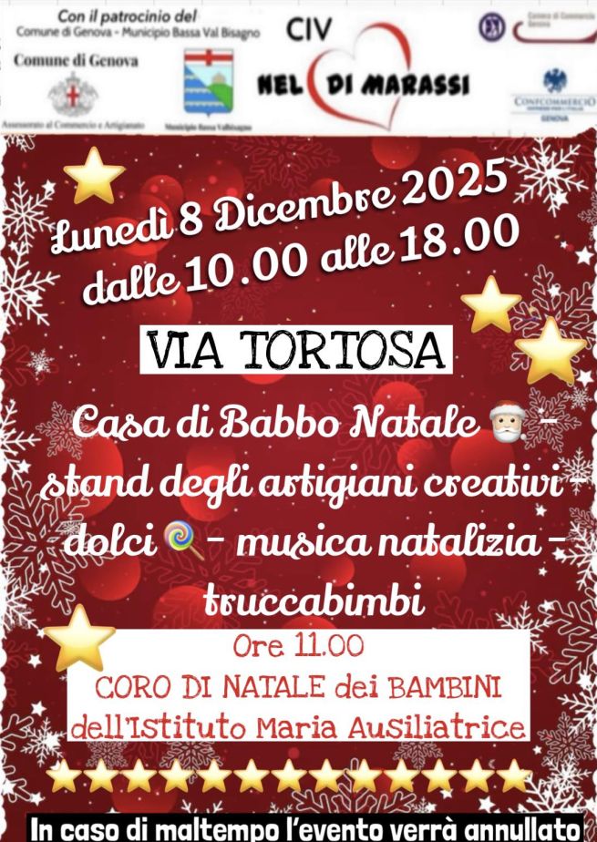 Torna la Festa di Natale nel quartiere di Marassi. Appuntamento in via Tortosa lunedì 8 dicembre 2025, festa dell'Immacolata, dalle ore 10 alle 19. Presenti Babbo Natale e la sua casa, gli elfi, i banchi dei creativì, dolci, musica, truccabimbi, associazioni, laboratori per bambini, e tanto altro. Alle ore 11 ci sono i bambini dell'Istituto Maria Ausiliatrice per un dolce coro di Natale. L'evento è organizzato dal Civ Nel Cuore di Marassi con il patrocinio del Comune di Genova - Municipio Bassa Val Bisagno. In caso di maltempo, l'evento è annullato.