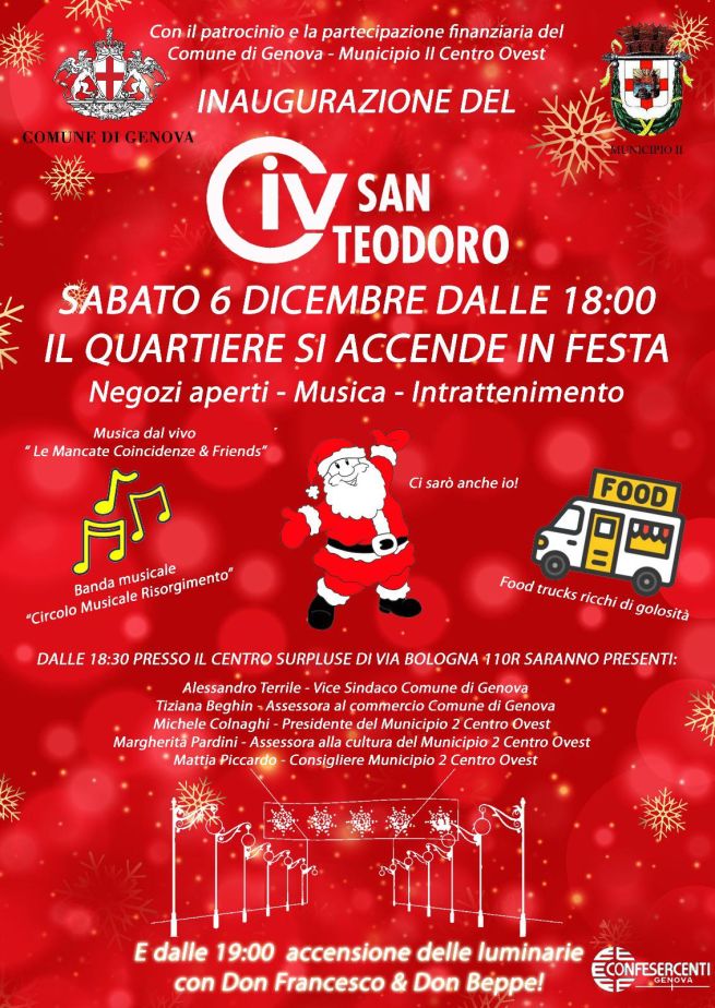 Dalle ore 18.30, al centro del riuso in via Bologna 110r (Ex Mercato), sono previsti gli interventi delle istituzioni. Poi, alle ore 19, accensione delle luminarie con Don Francesco & Don Beppe. Di seguito la locadina dell'evento, che vede l'inaugurazione del Civ San Teodoro.