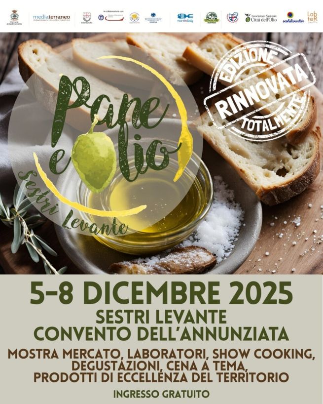 Torna, a Sestri Levante, l'appuntamento più atteso dell'inverno ligure: Pane e Olio, quattro giornate dedicate ai sapori autentici e alla cultura dell'extravergine da venerdì 5 a lunedì 8 dicembre 2025. Quest'anno la manifestazione si rinnova con una vera e propria mostra mercato al Convento dell'Annunziata: produttori d'eccellenza, artigiani, cuochi e mercati arricchiscono l'area in Baia del Silenzio. Un viaggio nel cuore della tradizione, tra show cooking, degustazioni, cene a tema e incontri con i protagonisti del gusto. L'ingresso è gratuito. Info, programma completo e aggiornamenti sulla pagina Facebook Pane e Olio.
