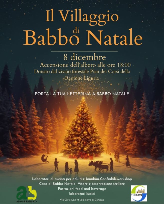 Lunedì 8 dicembre 2025, in Villa Serra di Comago (Comune di Sant'Olcese) si festeggia il Natale con il Villaggio di Babbo Natale: in programma attività per famiglie e bambini, laboratori a tema natalizio, punti ristoro e proposte gastronomiche, intrattenimento. Presente anche Babbo Natale, che ritira le letterine. Prevista anche l'accensione dell'albero di Natale alle ore 18.