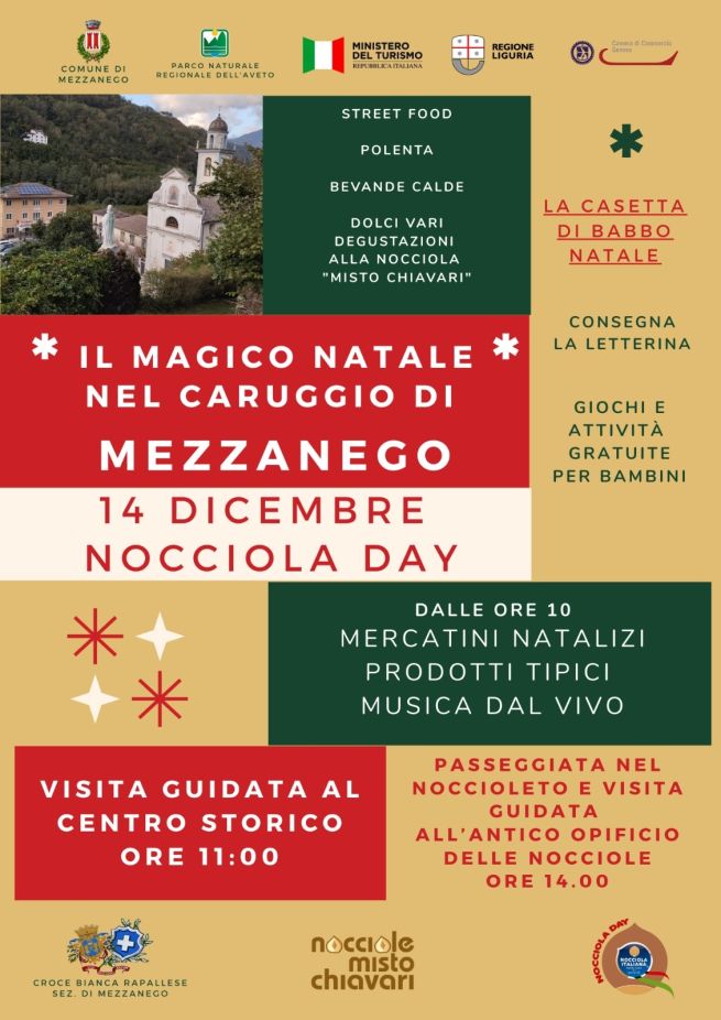 Domenica 14 dicembre 2025 appuntamento con il magico Natale nel Caruggio di Prati di Mezzanego. Si svolgono mercatini natalizi, una visita guidata dell'antico Caruggio, una passeggiata sugli antichi sentieri fino al noccioleto e la visita all'antico opificio delle Nocciole.