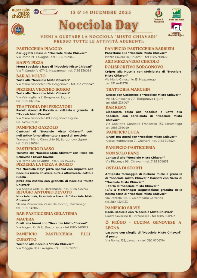 Prodotti tipici, in particolare alla nocciola "misto chiavari" degustazioni, street food, polenta e molte deliziosi piatti dolci e salati, musica dal vivo. Giochi vari per bambini e la Casetta di Babbo Natale. È un occasione per fare conoscere territorio, i prodotti locali e trascorrere una giornata in allegria. In contemporanea si tiene il Nocciola Day, per cui le attività aderenti pastificio, pasticcerie e ristoranti propongono prodotti, dolci e piatti alla nocciola "misto Chiavari".