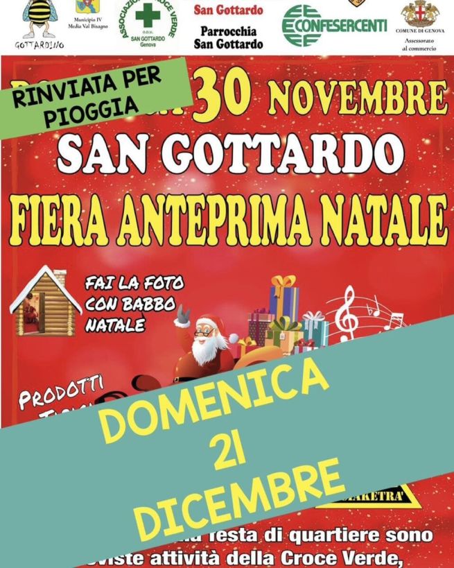 Domenica 21 dicembre 2025, il Civ Gottardino recupera la Fiera Anteprima Natale 2025, inizialmente programmata per il 30 novembre e rimandata causa maltempo. Diversi banchi animano via Piacenza e dintorni con artigianato, prodotti tipici, oggettistica, abbigliamento, musica in strada e tanta atmosfera natalizia. I bambini possono scattare una foto con Babbo Natale. Nell'ambito della festa di quartiere a San Gottardo sono previste attività della Croce Verde, della Parrocchia e della scuola. Di seguito la locandina dell'evento.