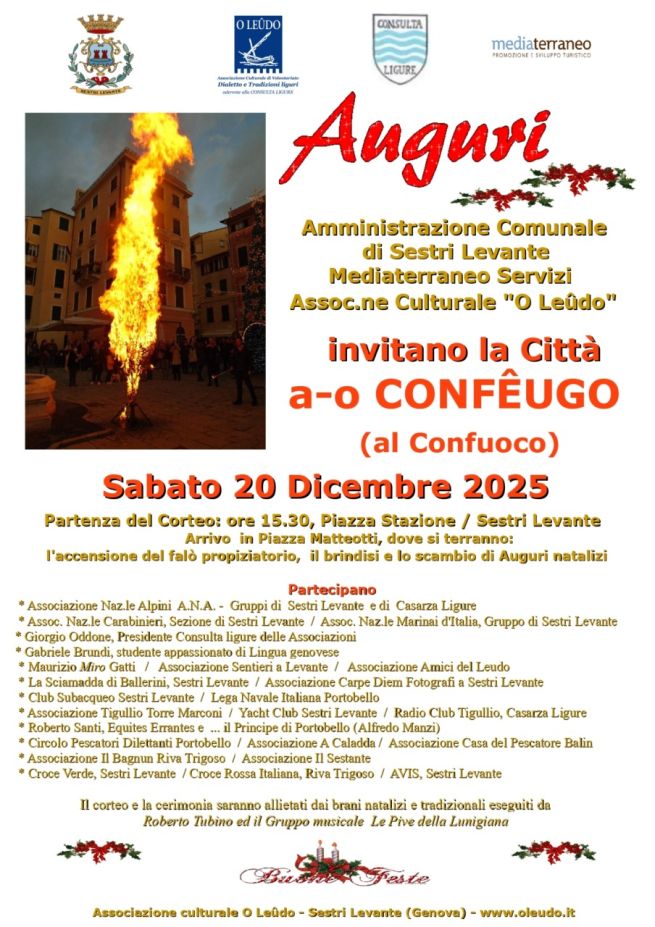 Come ogni anno, appuntamento con il tradizionale Confeugo a Sestri Levante, organizzato dall'associazione culturale O Leudo, dall'amministrazione comunale e da Mediaterraneo Servizi. La manifestazione prevede la formazione e la partenza del corteo dalla piazza della stazione alle ore 15.30 di sabato 20 dicembre 2025. L'arrivo è, come da tradizione, in piazza Matteotti dove è prevista l'accensione del falò propiziatorio, il brindisi e lo scambio degli auguri natalizi.