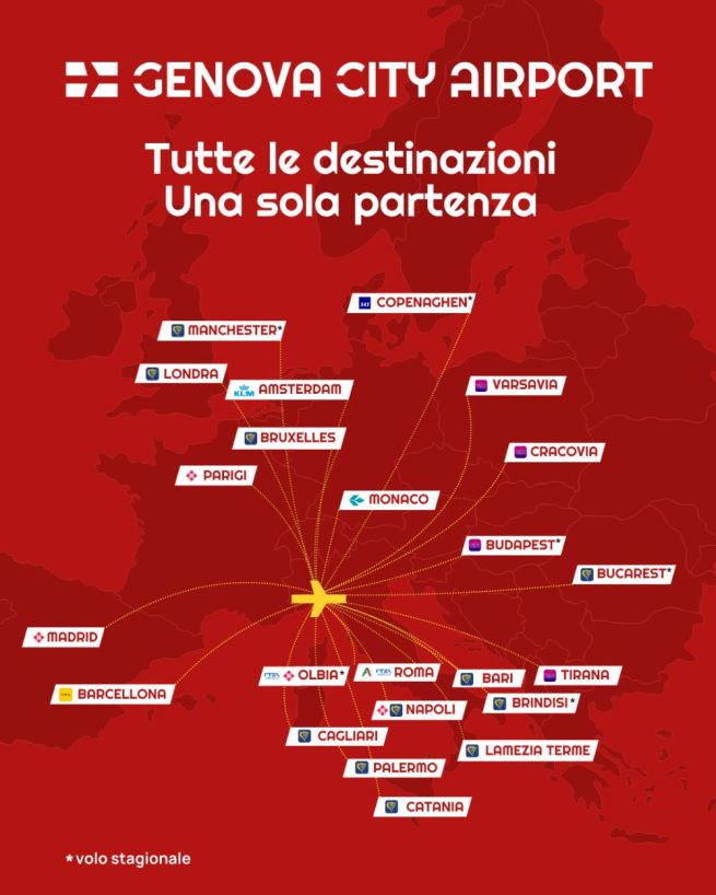 Con 26 rotte operate da 9 compagnie che collegano Genova a 23 destinazioni in 12 paesi europei, il Genova City Airport prosegue nel suo percorso di crescita con l'obiettivo di ampliare ulteriormente il network di destinazioni servite e diventare sempre più un punto di riferimento per i viaggiatori che scelgono la Liguria come destinazione di vacanza o giungono sul territorio per lavoro, senza dimenticare tutti coloro che, invece, desiderano partire da Genova per visitare altre destinazioni in Italia e all'estero. Ecco la mappa dei voli operativi da Genova.