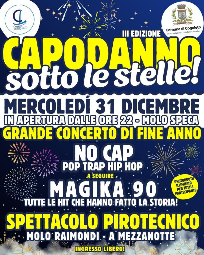 Mercoledì 31 dicembre, a Cogoleto, si saluta tutti insieme il 2026 con il Capodanno sotto le stelle (terza edizione). Dalle ore 22, nella cornice del Molo Speca, è in programma il concerto di Capodanno con i No Cap e i Magika 90: uno spettacolo senza pause con le migliori hit dance e non solo, dagli anni '90 a oggi. La musica è impreziosita da coreografie, spettacoli di luci e colori, effetti scenici e gadget per tutti. Il tutto presentato da Franco Nativo.