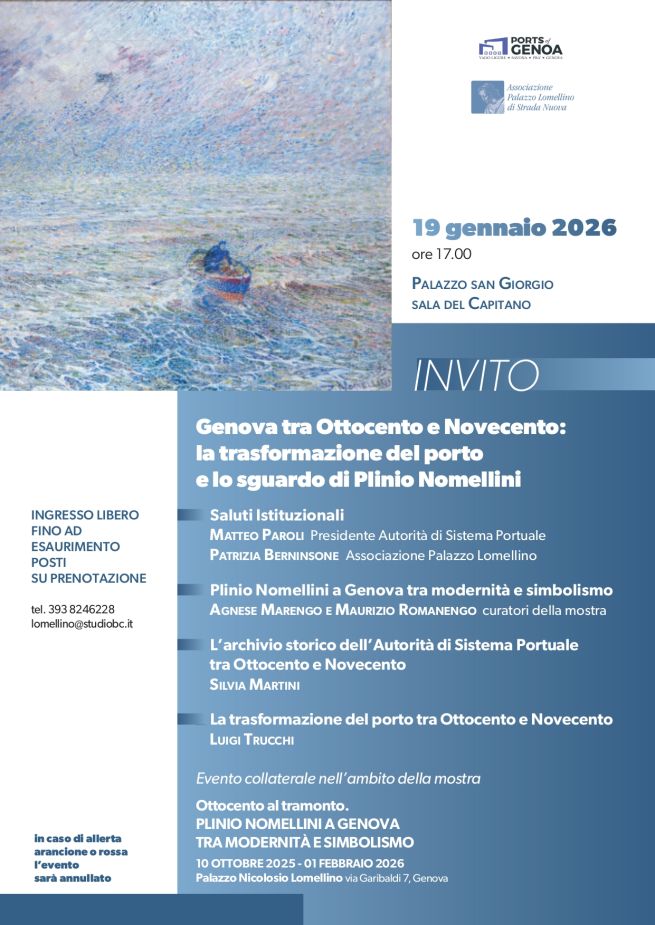 Genova, grazie a questa fase di rinnovamento, si affermò come città moderna, e la pittura di Nomellini ne fu uno specchio artistico, capace di cogliere tanto il fermento sociale quanto la nuova poetica del lavoro. La conferenza di lunedì 19 gennaio 2026, alle ore 17 a Palazzo San Giorgio, intende restituire una visione d’insieme, intrecciando arte, storia e documentazione, per comprendere meglio un momento cruciale della modernizzazione di Genova, del suo porto e il ruolo che l’arte ha avuto nel raccontarlo.