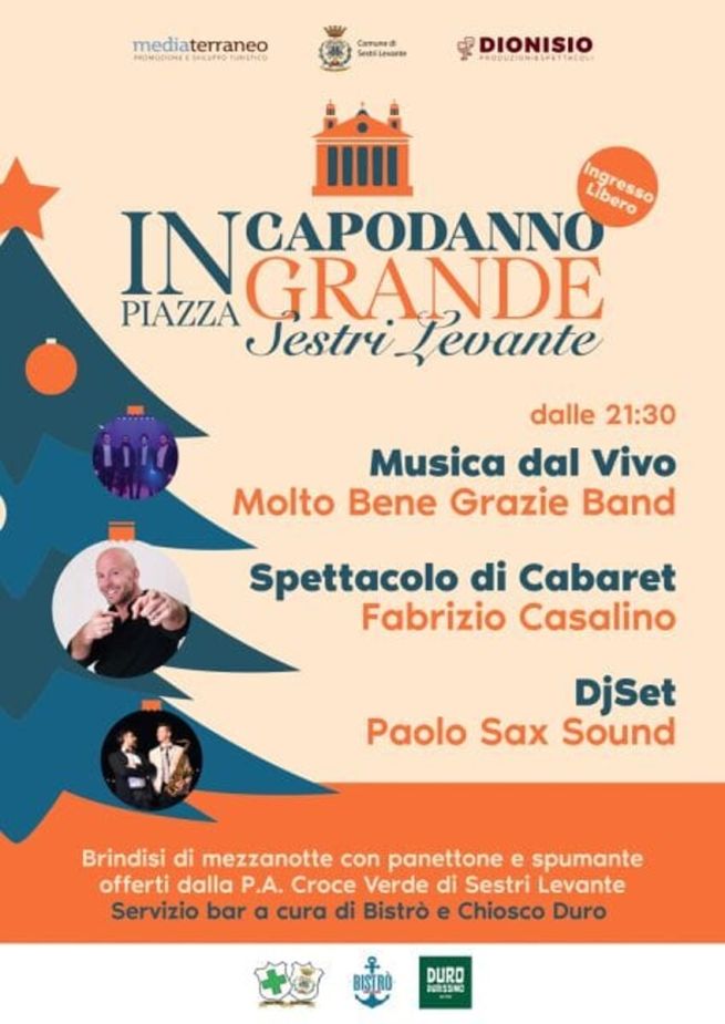 Sestri Levante saluta il 2026 con una festa di Capodanno in piazza Matteotti. Dalle ore 21.30 si parte la musica dal vivo dei Molto Bene Grazie Band, seguita dal cabaret del comico genovese Fabrizio Casalino fino allo scoccare della mezzanotte. Dopo il brindisi, accompagnato da panettone e spumante offerti dalla P.A. Croce Verde di Sestri Levante, la serata prosegue con il Dj set di Paolo Sax Sound.
