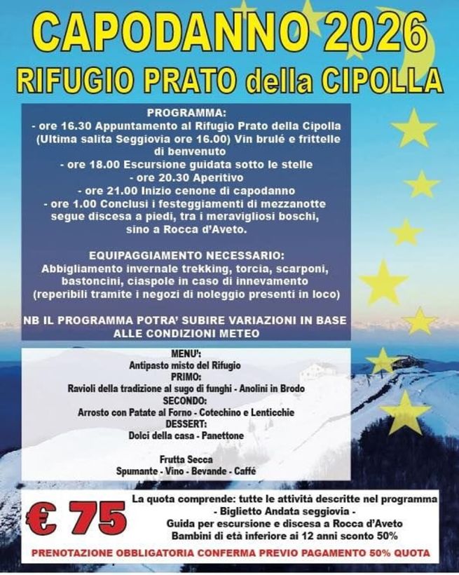 Mercoledì 31 dicembre si festeggia il Capodanno 2026 al Rifugio Prato della Cipolla, nella suggestiva Val d'Aveto. Ci sarà anche la neve? Di seguito il programma della serata: