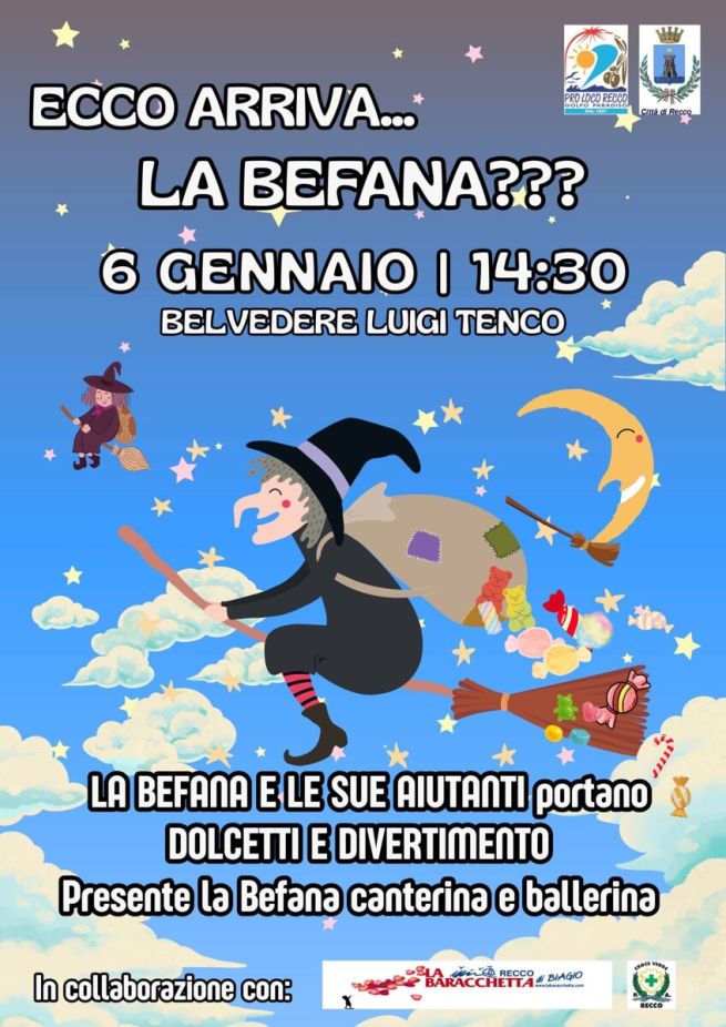 Martedì 6 gennaio 2026, alle ore 14.30 presso il Belvedere Luigi Tenco, la Pro Loco di Recco, con il patrocinio del Comune di Recco e la collaborazione della Baracchetta di Biagio, organizza l'evento Ecco arriva la Befana.