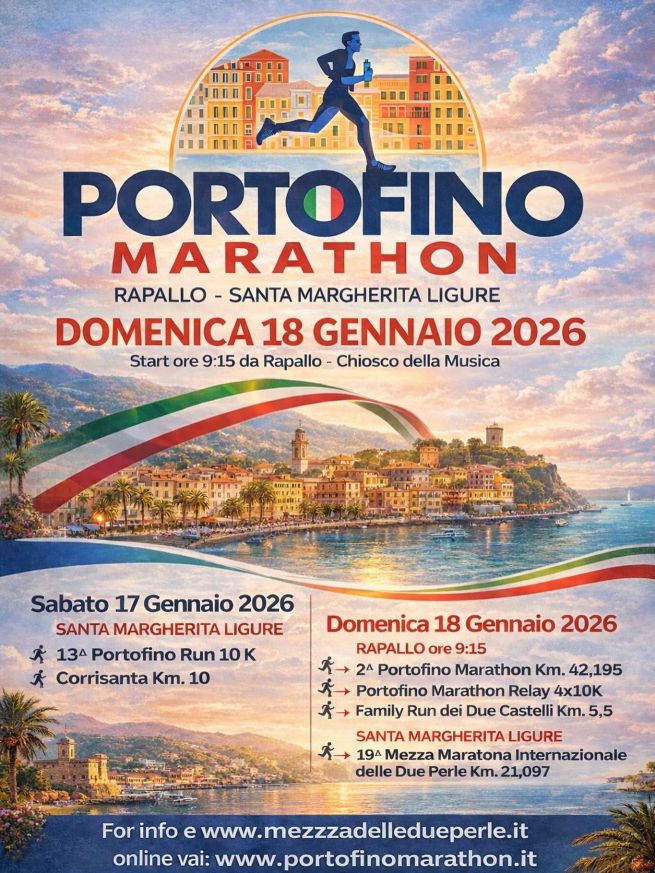 Sabato 17 e domenica 18 gennaio 2026, il Tigullio teatro di uno degli appuntamenti più attesi del calendario invernale del running. Sabato, con partenza alle ore 15 da piazza Vittorio Veneto a Santa Margherita Ligure, prende il via la 13esima Portofino Run (10 km), accompagnata come da tradizione dalla CorriSanta - Family Run.
