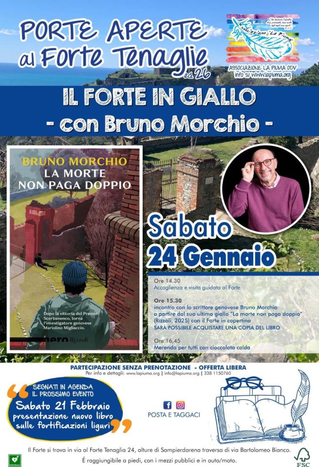 Il maestro genovese del giallo Bruno Morchio per la prima volta al Forte Tenaglie a presentare il suo ultimo romanzo, dal titolo La morte non paga doppio (Rizzoli 2025), che in copertina ha proprio uno scorcio del Forte. Questo il programma della giornata di sabato 24 gennaio 2026 sulle alture di Sampierdarena: