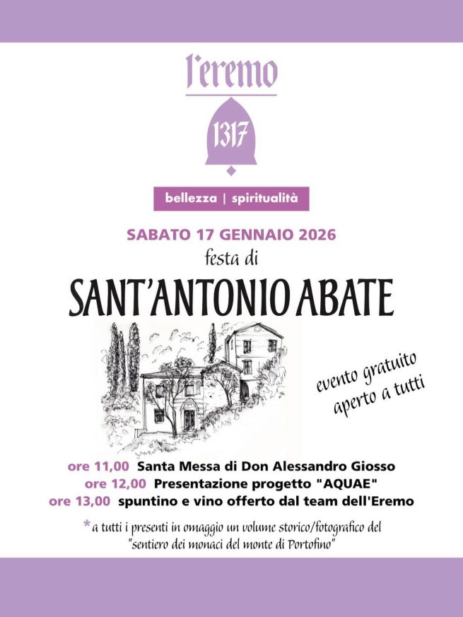 Festa di Sant'Antonio Abate in programma sabato 17 gennaio 2026 a Portofino. Il programma della giornata prevede: ore 11 Santa Messa; ore 12 presentazione del progetto 'Aquae', ore 13 spuntino e vino offerti dal team dell'Eremo. A tutti i presenti in omaggio un volume storico/fotografico sul Sentiero dei Monaci del Monte di Portofino. Un occasione per ritrovarsi, camminare insieme e celebrare una tradizione antica in un luogo senza tempo.