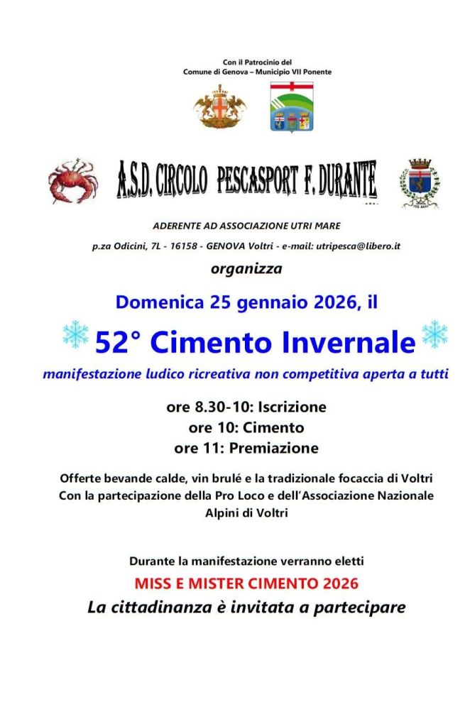L'evento, organizzato dall'A.S.D. Circolo Pescasport F. Durante (aderente all’Associazione Utri Mare, piazza Odicini 7L) con il patrocinio del Municipio VII Ponente, è ormai un appuntamento fisso per chi vuole sfidare le temperature rigide del Mar Ligure in un clima di festa e condivisione. Non si tratta di una gara, ma di una manifestazione ludico-ricreativa non competitiva aperta a tutti: dai veterani del tuffo fuori stagione alle famiglie, fino ai curiosi che preferiscono restare a guardare (ben coperti) dal litorale. Questi programma e orari della settimana: