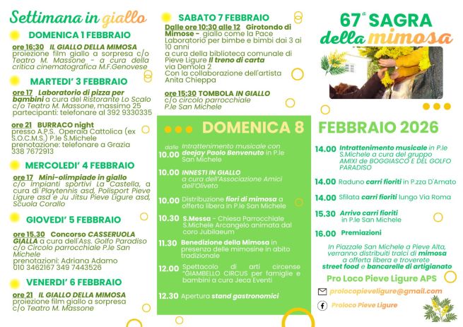 La Sagra della Mimosa, giunta alla 67esima edizione, torna domenica 8 febbraio 2026 a Pieve Ligure. La festa, organizzata dalla Pro Loco Pieve Ligure in collaborazione con il Comune di Pieve Ligure, coinvolge l'intero paese, che viene festosamente decorato in giallo e con rami di mimosa già dalla settimana precedente l'evento, la cosiddetta Settimana in Giallo.