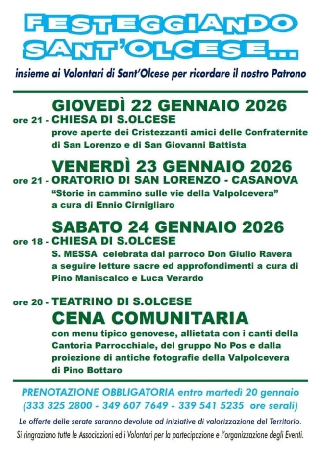 Si parte giovedì 22 gennaio 2026 con le prove aperte dei Cristezzanti delle confraternite di San Lorenzo e San Giovanni Battista. Si prosegue venerdì 23 gennaio 2026, presso l'Oratorio di San Lorenzo con una serata dedicata alla storia e ai cammini della Valpolcevera, e si conclude sabato 24 gennaio 2026 con la Santa Messa, momenti di approfondimento e la tradizionale cena comunitaria al Teatrino di Sant’Olcese, con menù tipico genovese, accompagnato da musica, canti della Cantoria Parrocchiale e immagini storiche. Prenotazione entro martedì 20 gennaio. Le offerte delle serate sono devolute a iniziative di valorizzazione del territorio. Di seguito la locandina con il programma completo.