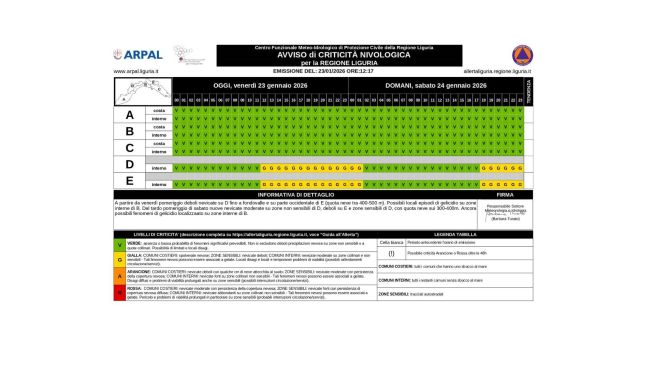 Con l'avvicinarsi dei 'giorni della merla', le temperature sono tornate rigide a Genova e in Liguria. Arpal prolunga l'allerta gialla per neve sulla zona D (entroterra savonese, versanti padani di ponente) e sulla zona E (Valle Scrivia, Val d'Aveto e Val Trebbia) dalle ore 12 di venerdì 23 alle 2 di sabato 24 gennaio 2026. Dopo una breve pausa scatta una nuova allerta gialla per neve, sempre sui versanti padani (sempre zone D ed E), dalle ore 18 di alle 23.59 di sabato 24 gennaio 2026.
