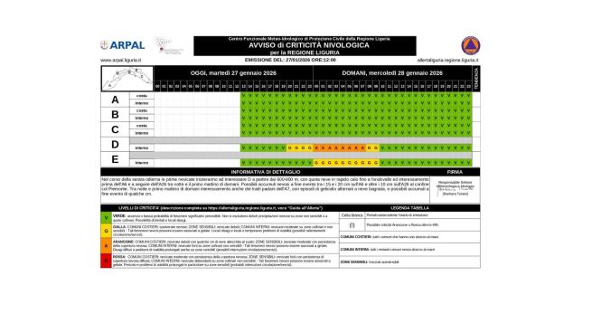 Sui versanti padani di levante (zona E, ovvero Val d'Aveto, Val Trebbia e Valle Scrivia) scatta l'allerta gialla per neve dalle 00.00 alle 10 di mercoledì 28 gennaio 2026. Possibili fiocchi anche nell'entroterra genovese. Si segnala inoltre bassa probabilità di forti temporali su A, B e C nella giornata di martedì 27 gennaio 2026 e su A, B, C ed E nella giornata di mercoledì 28 gennaio 2026. Sono attesi aggiornamenti.