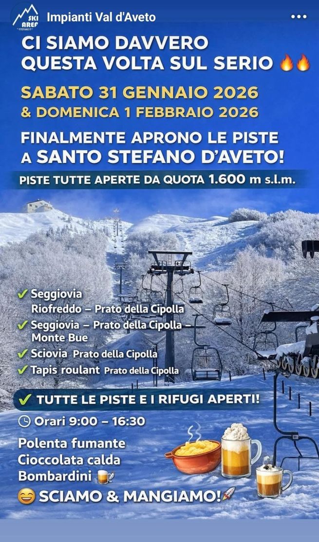 Impianti aperti: Seggiovia Riofreddo - Prato della Cipolla; Seggiovia Prato della Cipolla - Monte Bue; Sciovia Prato della Cipolla; Tapis roulant Prato della Cipolla. Piste aperte: Blu Fraccia dal Monte Bue a Prato della Cipolla; Rossa Marco Corvisiero (parte alta); Pista Agonistica; Campo Scuola Baby Prato della Cipolla; Collegamenti aperti. Orario impianti: 9-16.30.