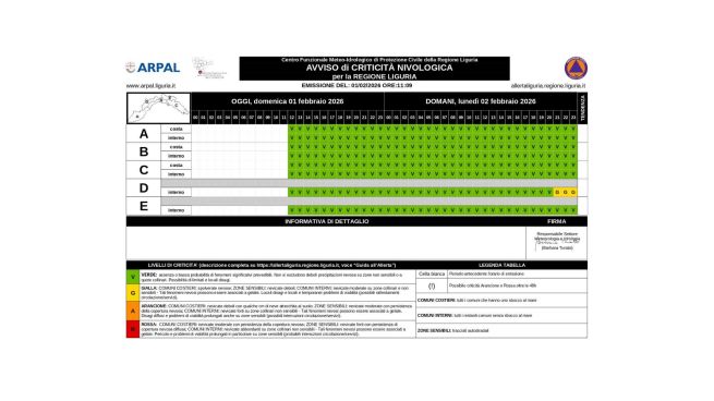 Si segnalano nella serata deboli nevicate nell'entroterra con quota neve in calo fino al suolo in serata su D, parte orientale di E e interno di B, dove potrebbero esserci possibili fenomeni di gelicidio o pioggia congelantesi. Precipitazioni nevose che proseguiranno anche nella notte e nella mattina di martedì 3 febbraio 2026. Nel centro della regione ci sono piogge tra deboli e moderate.