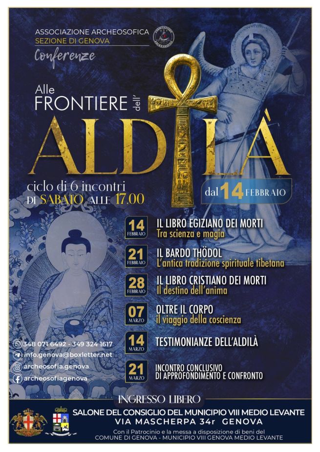L'Associazione Archeosofica di Genova, presso il Salone del Consiglio del Municipio VIII Medio Levante di Genova, terrà una serie di conferenze aperte a tutti, tutti i sabati a partire dal 14 di febbraio al 21 marzo, ore 17.