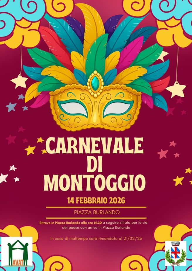 Sabato 14 febbraio 2026 è in programma il Carnevale di Montoggio, con una sfilata per le vie del paese. Ritrovo in piazza Burlando alle ore 14.30 e partenza del corteo in maschera con ritorno in piazza al termine del percorso. In caso di maltempo, l'evento è rimandato a sabato 21 febbraio 2026.