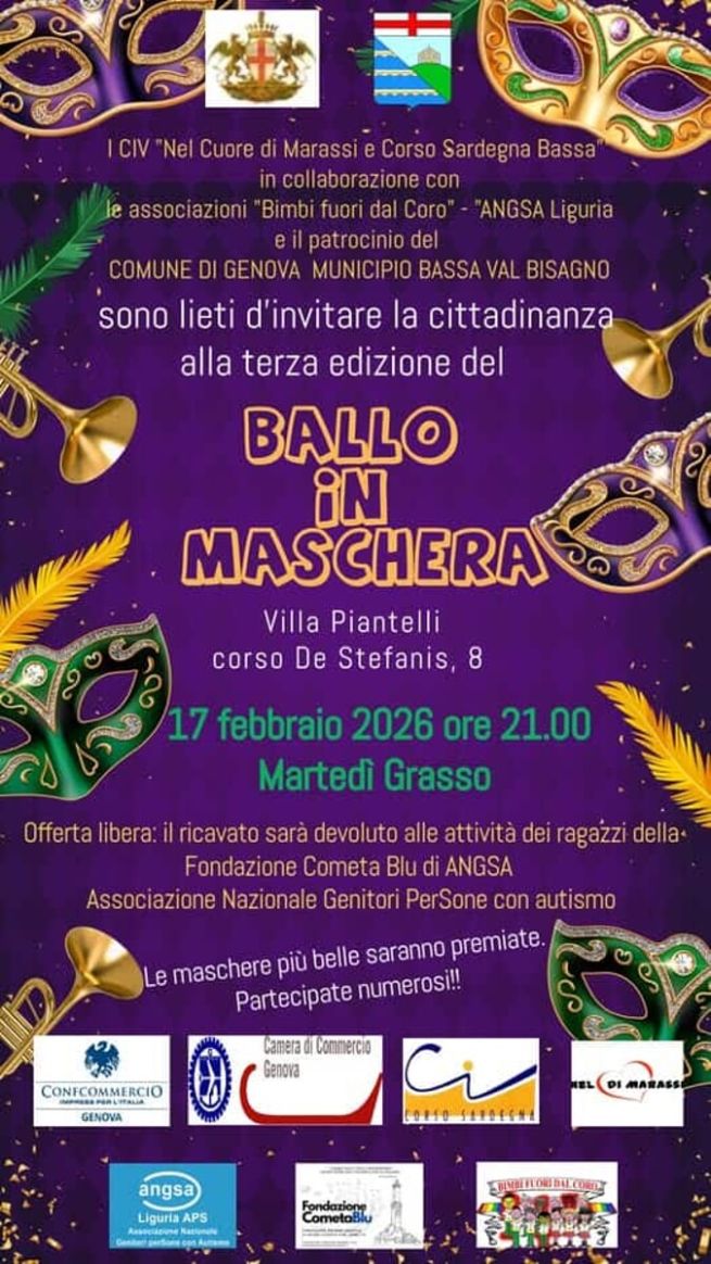 I CIV Corso Sardegna Bassa e Nel Cuore di Marassi, in collaborazione con le associazioni Bimbi fuori dal Coro e ANGSA Liguria organizzano l'appuntamento con la Festa di Carnevale, che quest'anno si svolge martedì 17 febbraio 2026 (alle ore 21) a Villa Piantelli in corso De Stefanis 8: ballo in maschera con premiazione finale delle maschere più belle.