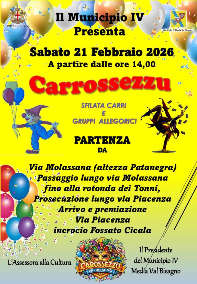 Sabato 21 febbraio 2026, a partire dalle ore 14, il Municipio 4 Media Val Bisagno aspetta grandi e piccini per un pomeriggio di festa, colori e allegria in Val Bisagno. In programma il Carrossezzu con sfilata di carri e gruppi allegorici con partenza da via Molassana (altezza Patanegra).