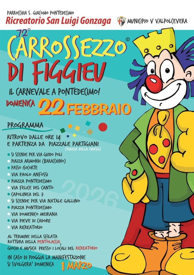 Torna, per Carnevale, il Carrossezzo di Figgieu di Pontedecimo, giunto alla 72esima edizione. Appuntamento domenica 22 febbraio 2026, alle ore 14, per il ritrovo e la partenza in piazzale Partigiani. La sfilata prosegue dunque per le vie e le piazze di Pontedecimo fino a giungere in via Ricreatorio. Al termine rottura della pentolaccia, giochi e musica presso i locali del ricreatorio. In caso di pioggia, la manifestazione verrà posticipata a domenica 1° marzo. Di seguito la locandina con il percorso.