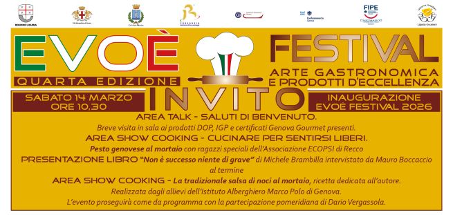 Il Consorzio della Focaccia di Recco col formaggio, che ha ottenuto nel 2015 il marchio di tutela comunitario I.G.P. per il prodotto di cui porta il nome, con il Comune di Recco, Regione Liguria, Città Metropolitana di Genova, Camera di Commercio di Genova, FIPE-Confcommercio Liguria e FEPAG-Confcommercio Genova, organizza la quarta edizione dell'evento in onore al patrimonio gastronomico italiano: Evoè, il Festival dell'Arte gastronomica e dei prodotti d'eccellenza. Appuntamento nelle giornate di sabato 14 e domenica 15 marzo 2026.