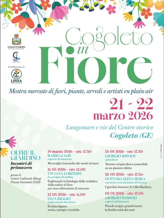 Un fine settimana dedicato alla natura, alla creatività e al mondo botanico. In programma: espositori di fiori e piante, laboratori creativi per bambini, musica dal vivo con pianoforte e swing e artisti all'aperto. Previsto anche Oltre il Giardino - Incontri di Primavera presso il Centro Culturale Sbragi, con approfondimenti con esperti del settore. Di seguito il programma di Cogoleto in Fiore.