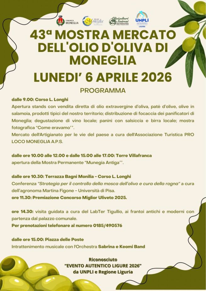 43esima edizione per la Mostra mercato dell'olio d'oliva di Moneglia, manifestazione certificata Evento autentico ligure da Unpli e Regione Liguria, che propone stand gastronomici, conferenze, mostre e visite guidate per promuovere una maggior conoscenza di un alimento prezioso e tipico del territorio. Appuntamento lunedì 6 aprile 2026, nel giorno della festa di Pasquetta.