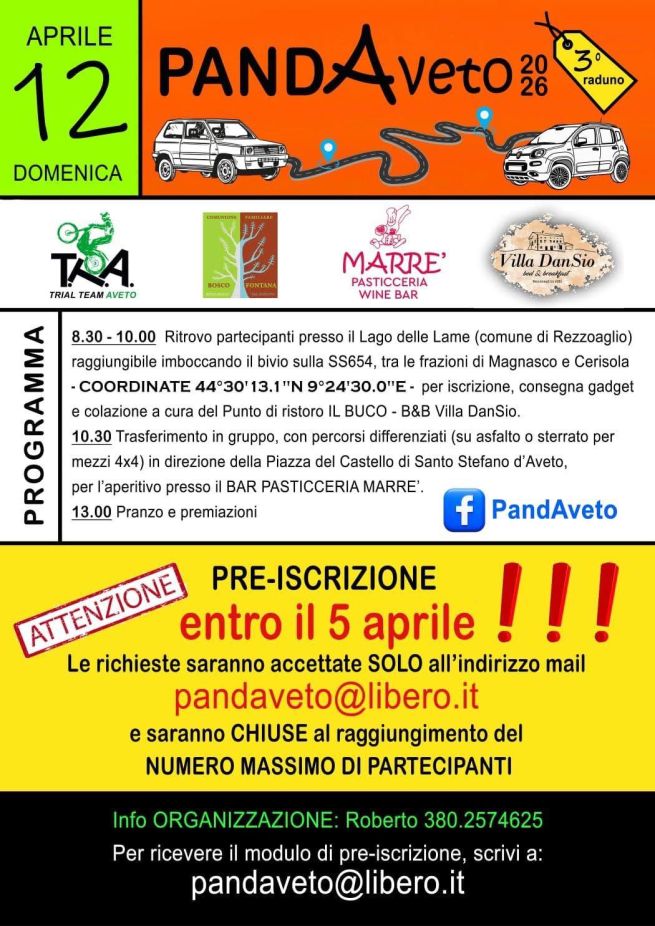 Domenica 12 aprile 2026 torna PandAveto, il grande raduno delle iconiche Fiat Panda in Val d'Aveto. Quest’anno la partenza è dal Lago delle Lame (comune di Rezzoaglio), con arriva al Castello di Santo Stefano d’Aveto. La giornata inizia tra le 8.30 e le 10 al Lago delle Lame, dove i partecipanti si ritrovano per le iscrizioni, un momento conviviale e la colazione.