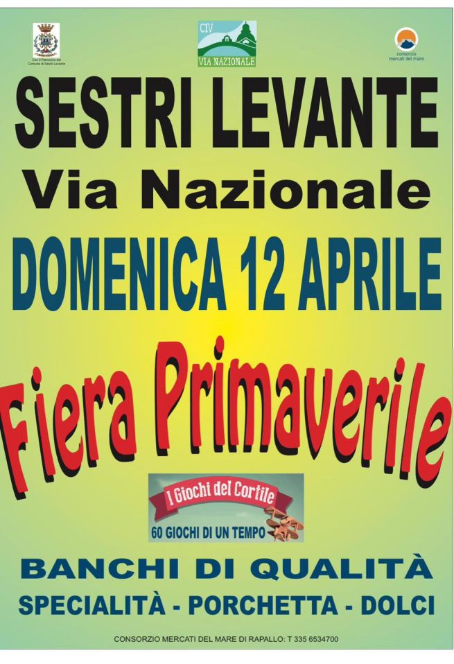 La fiera coinvolge le attività in sede fissa di via Nazionale, con negozi aperti ed esposizioni dedicate, mentre bar e ristoranti contribuiscono all'atmosfera di festa con vetrine a vista e proposte gastronomiche da gustare passeggiando. A rendere ancora più vivace la giornata sono, a cura del CIV di via Nazionale, le esibizioni di bambini, ragazzi e giovani artisti delle scuole di canto e ballo di Sestri Levante Sestri Levante. Evento organizzato dal CIV Via Nazionale in collaborazione con il Consorzio Mercati del Mare di Rapallo, con il patrocinio del Comune di Sestri Levante. Ulteriori informazioni e aggiornamenti sulla pagina facebook del Comune di Sestri Levante.